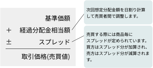 基準価額に保有日数分の経過分配金相当額を加算し、そこに取引手数料相当額にあたるスプレッド料率分の金額を加算・減算して取引価格を生成しています。